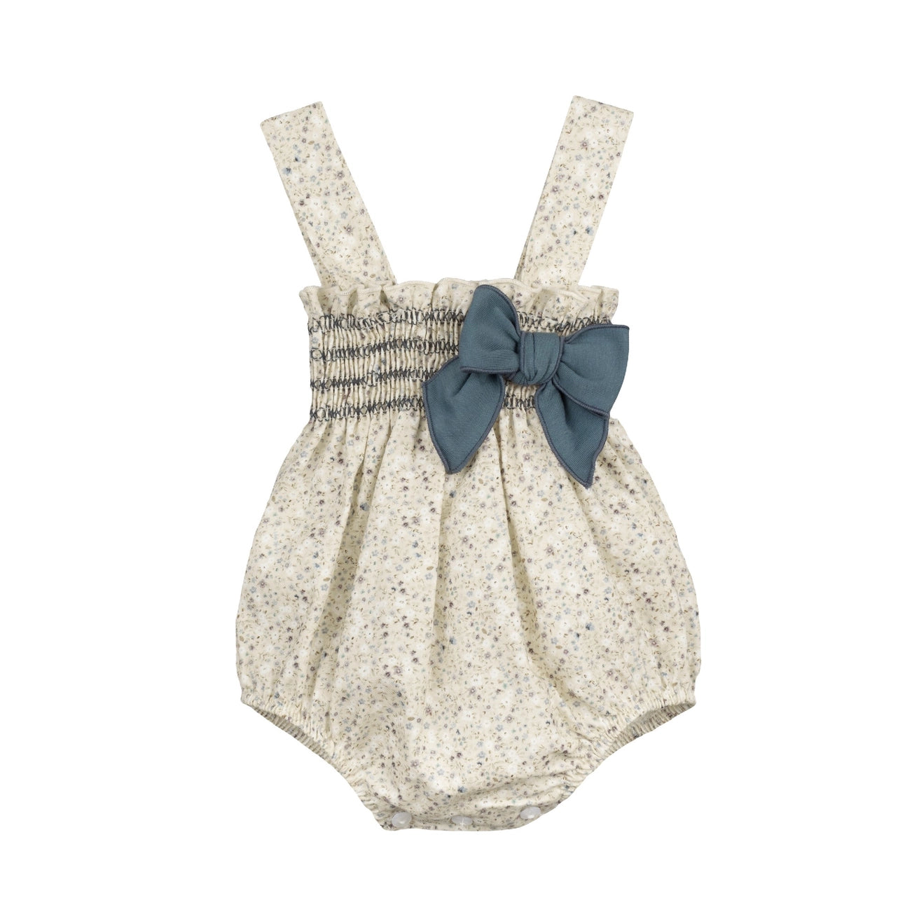 • The perfect complement to the smocked romper with subtle pastel tones and a bow detail.