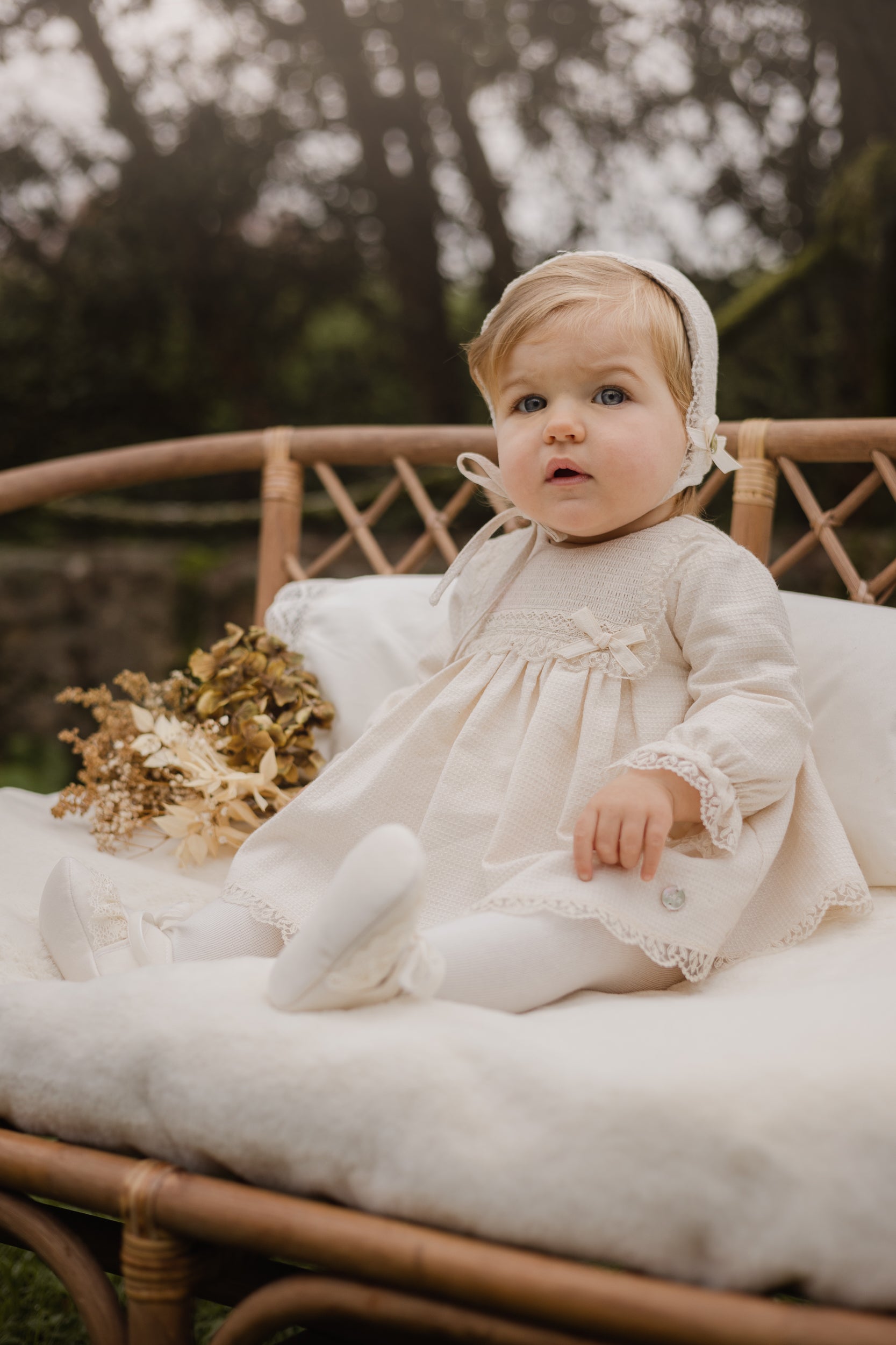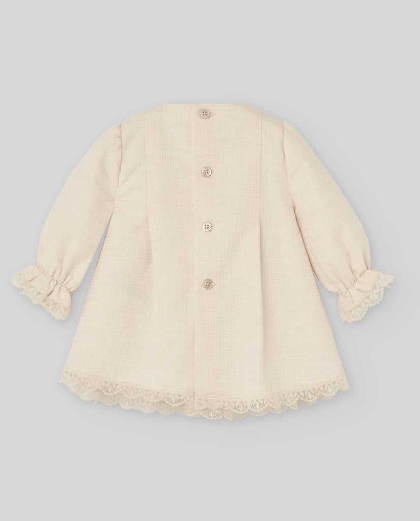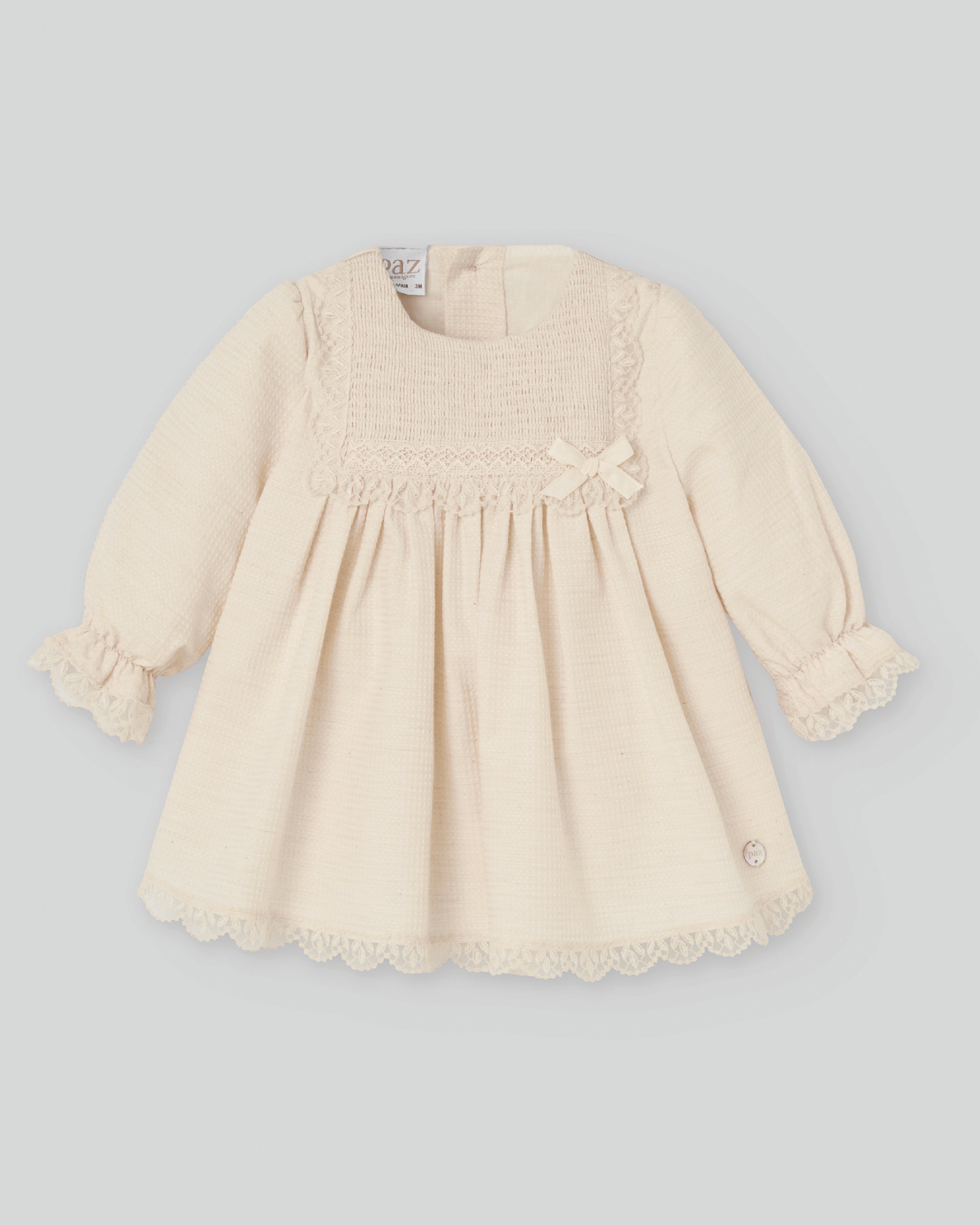 • It features a square bib front with delicate smocking, a frilled collar, and long sleeves with lace-trimmed cuffs.