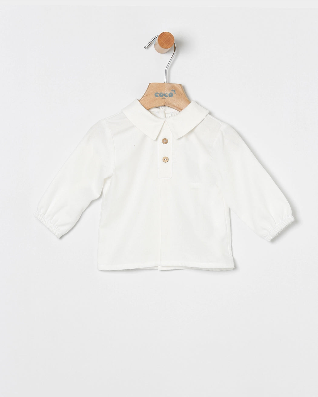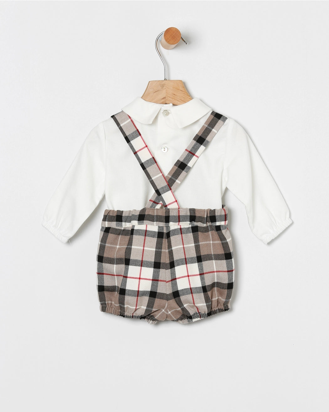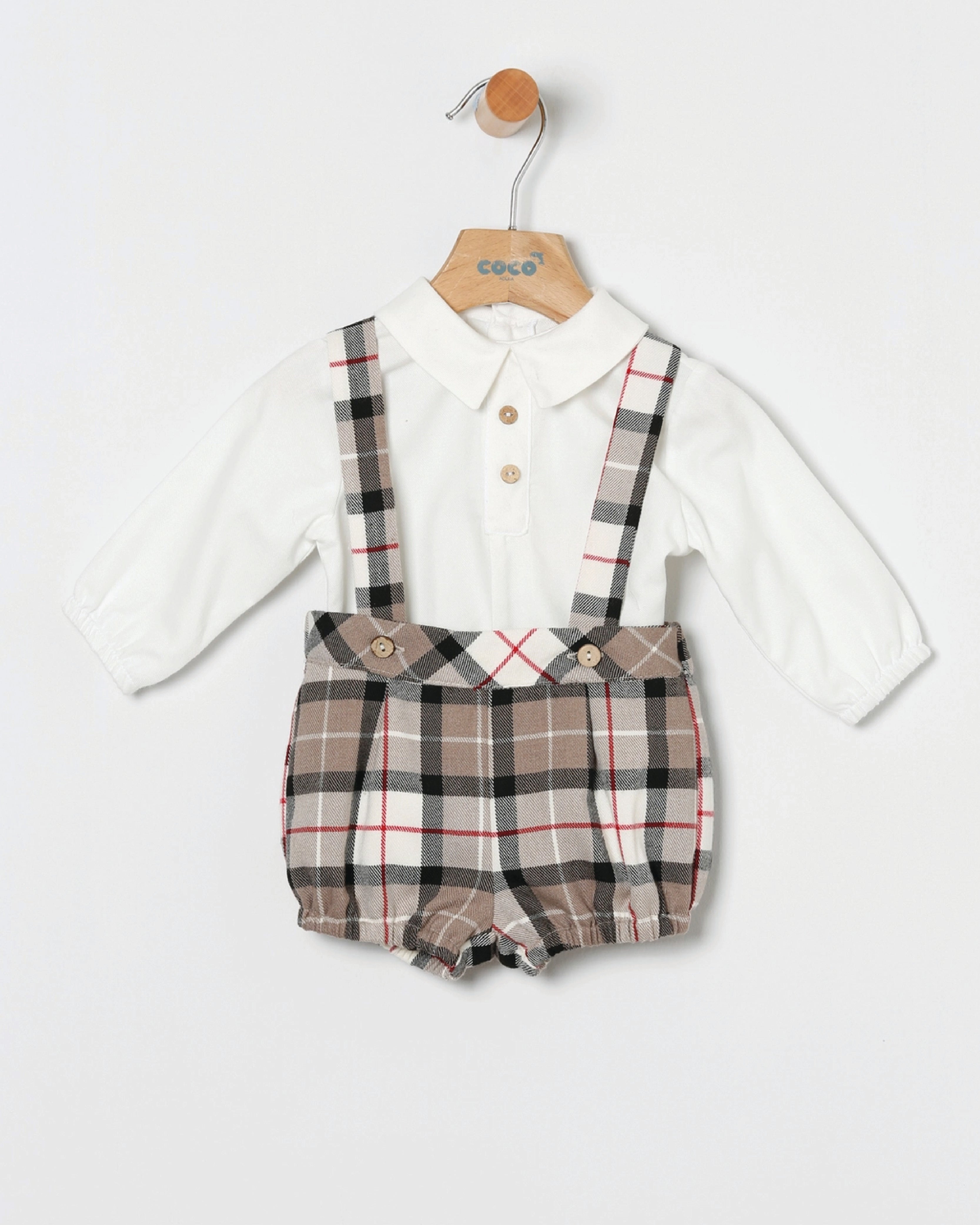 This classic baby boy set features a soft white cotton blouse with a Peter Pan collar and wooden buttons, paired with adorable plaid suspender bloomers in neutral brown tones with a hint of burgundy.