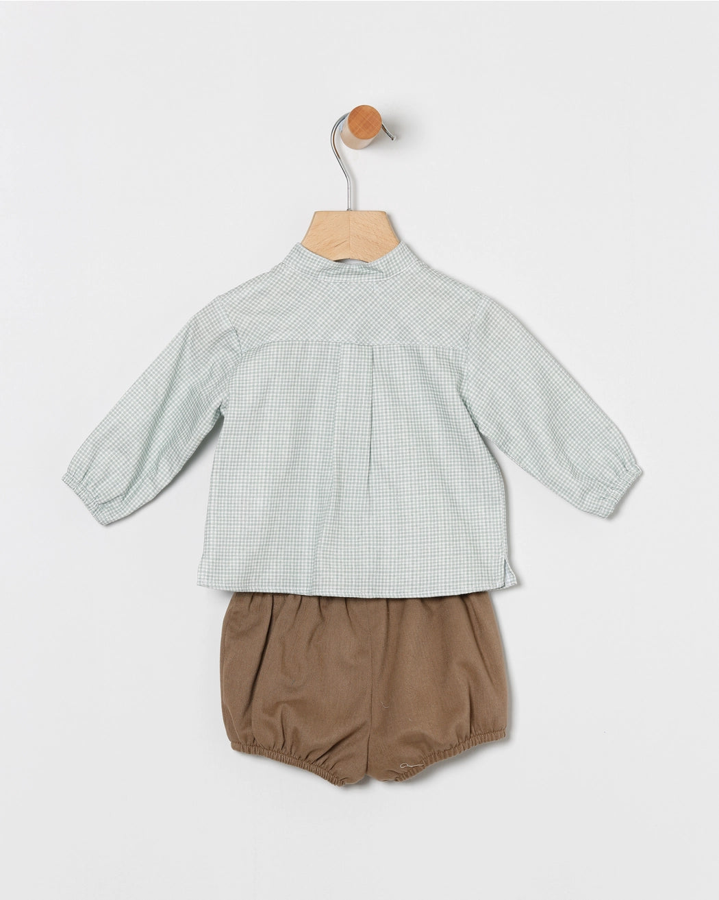 The soft green check shirt features wooden buttons and a cute embroidered owl detail, paired with brown bloomer shorts that have an elasticated waist and leg openings for a perfect fit.