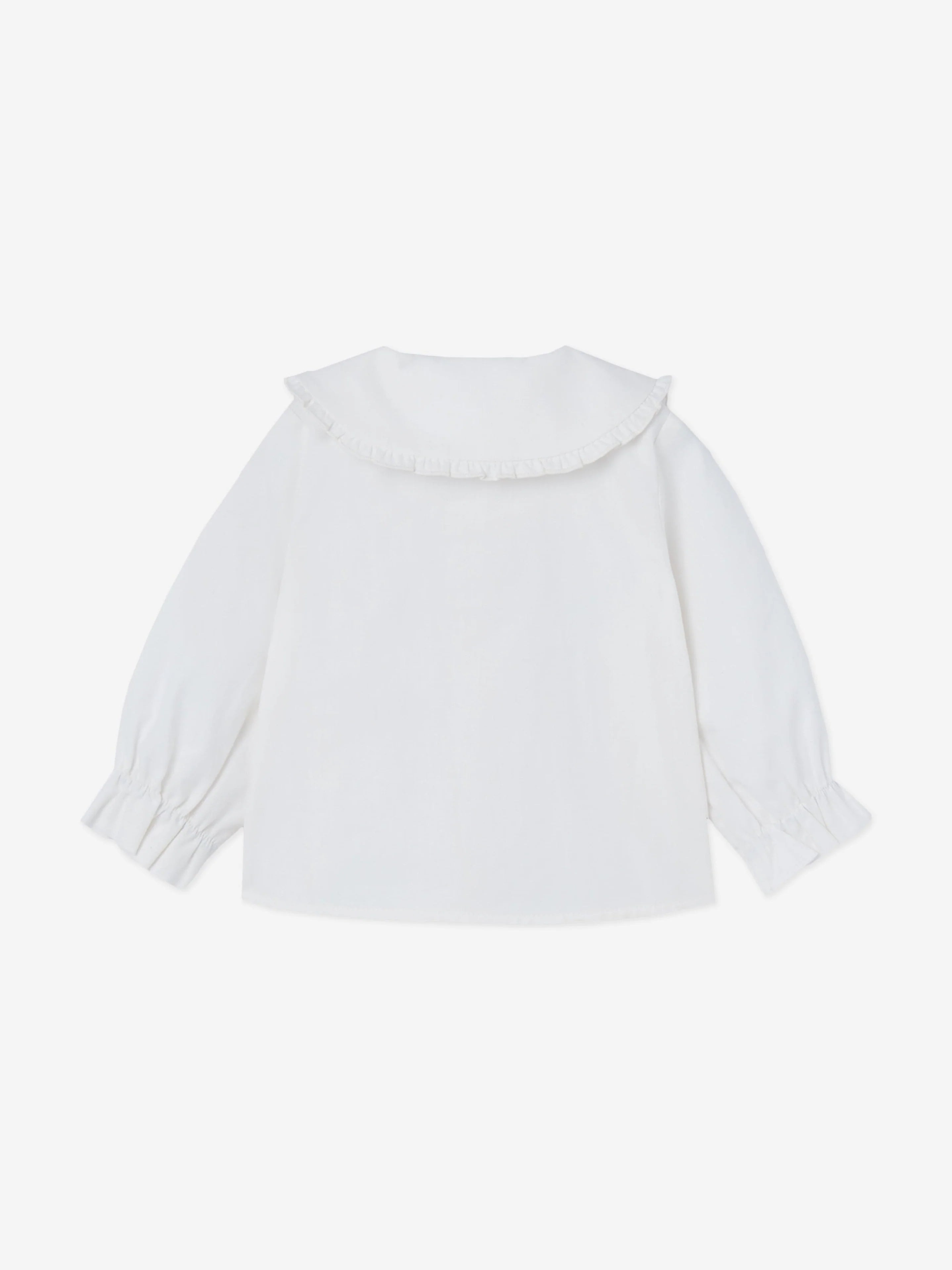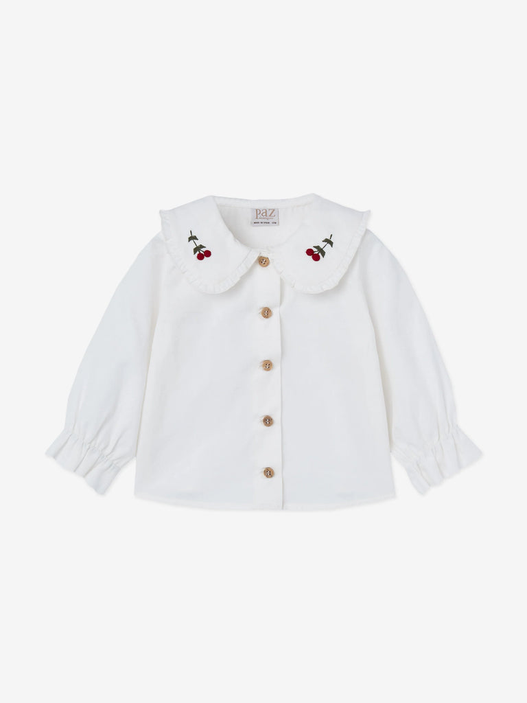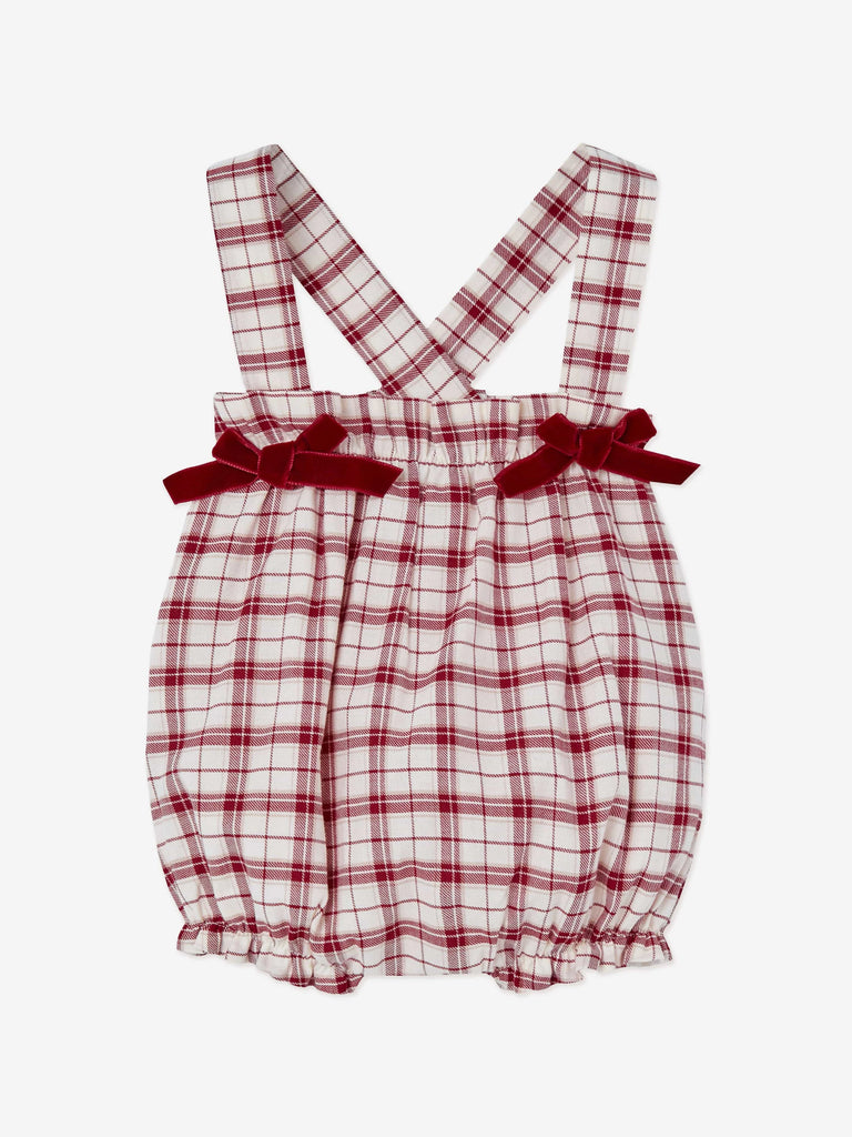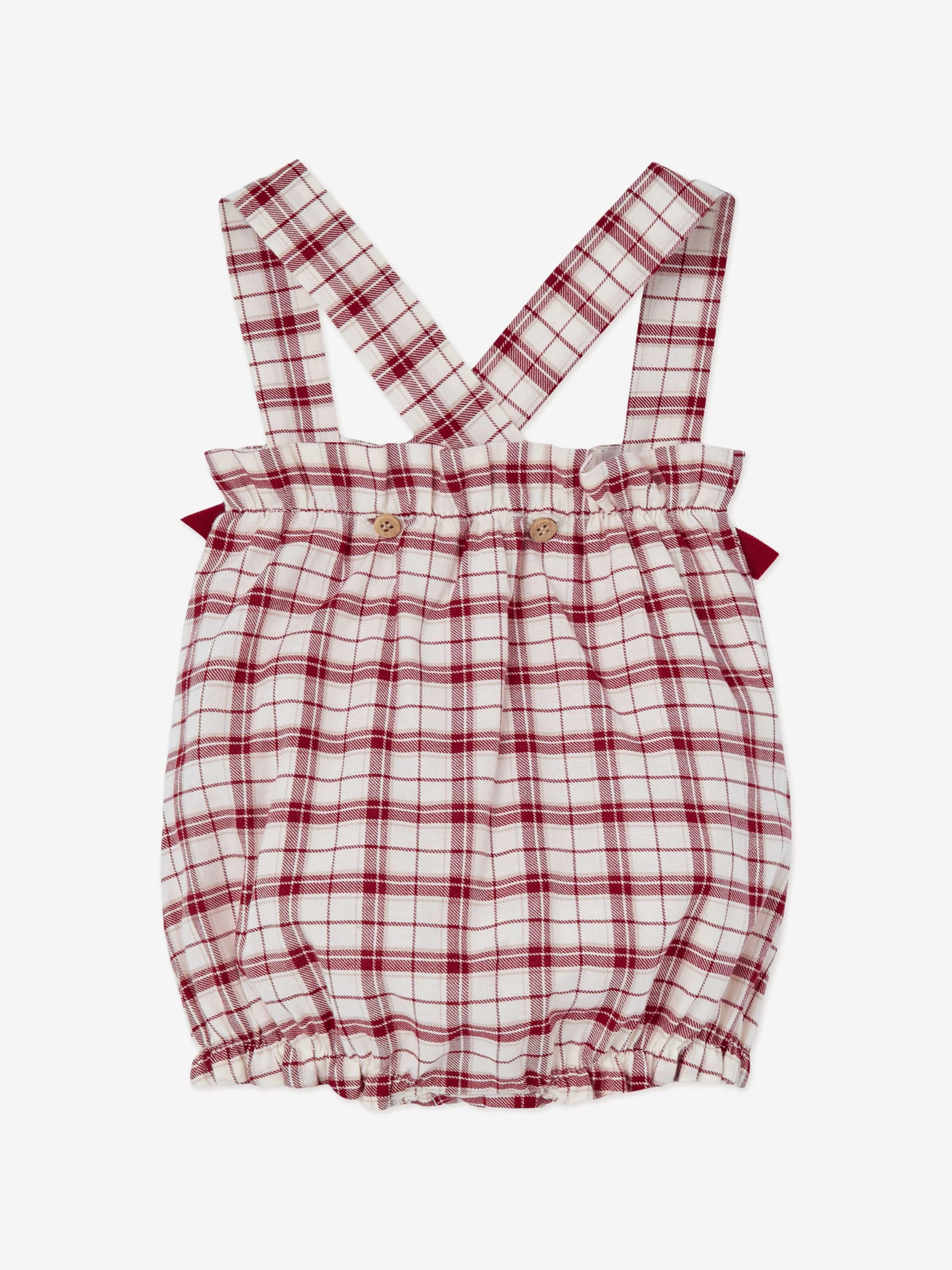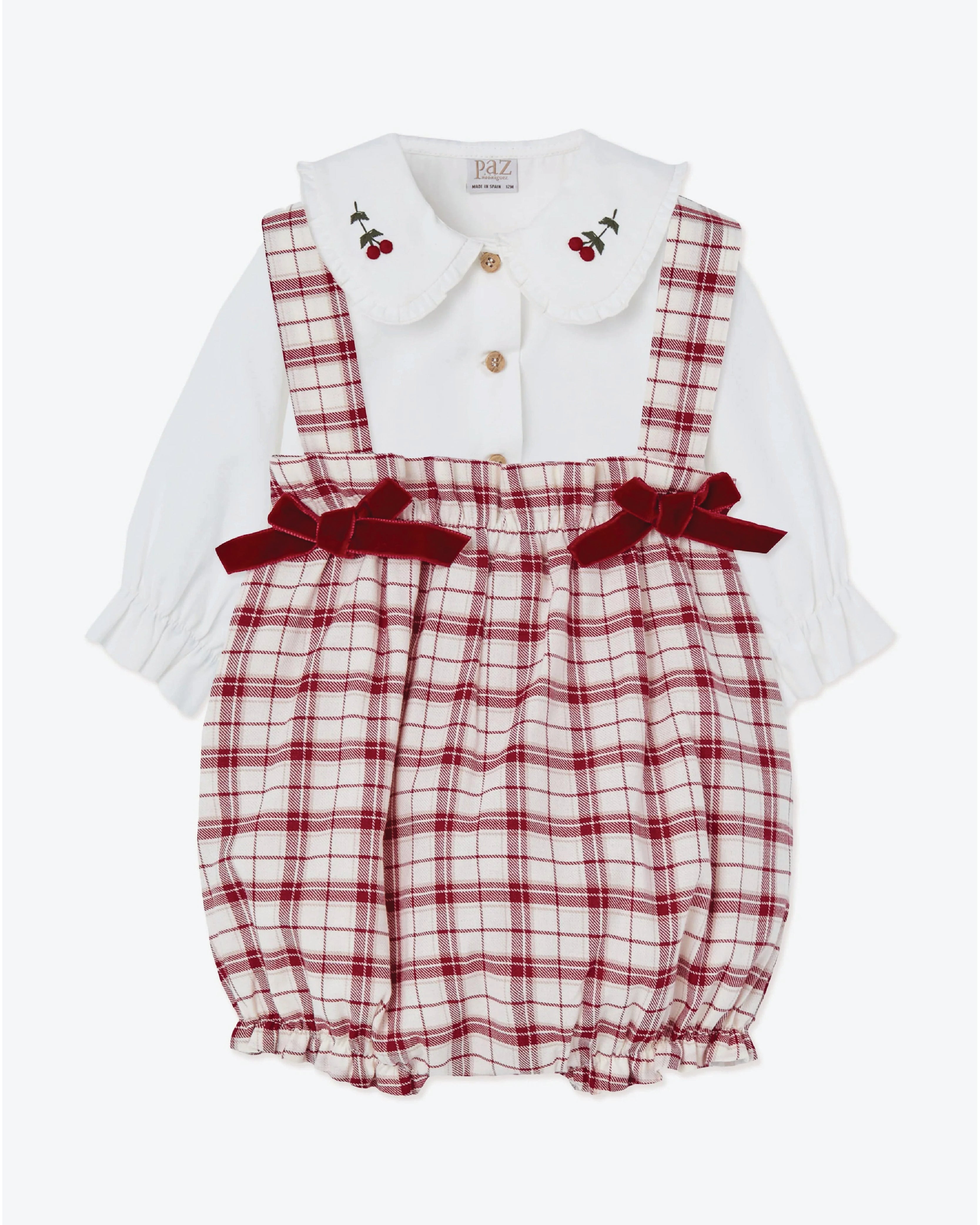 This charming two-piece baby set by Paz Rodríguez features a soft white blouse with an embroidered cherry collar and wooden buttons, paired with a plaid suspender bloomer in red and ivory tones.