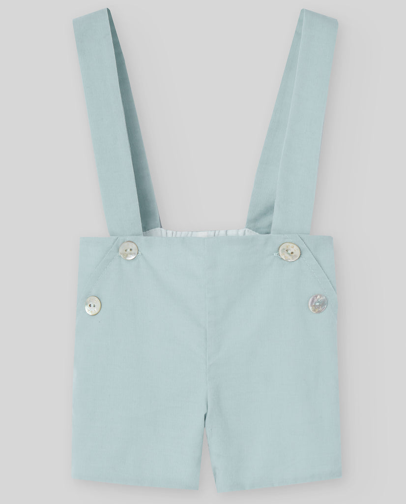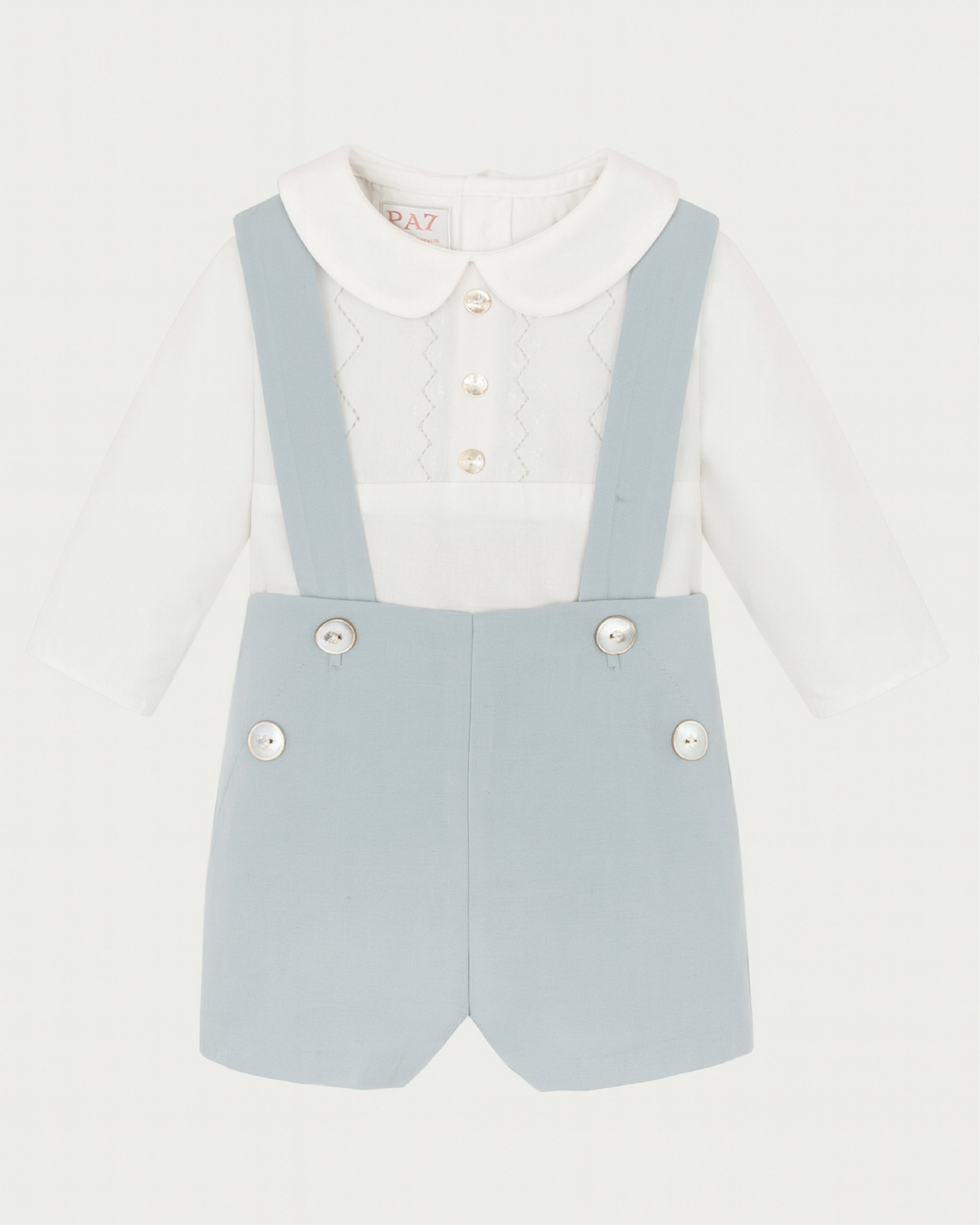 Classic and elegant, this Paz Rodríguez baby boy set includes a white cotton shirt with a Peter Pan collar and decorative stitching, paired with a sky blue suspender romper featuring pearl-style buttons.